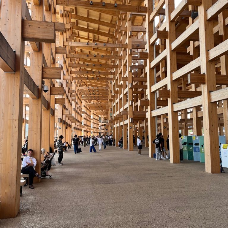 Im Mittelpunkt der Weltausstellung stand der monumentale Grand Ring – eine architektonische Ausnahmeerscheinung und aktuell die größte Holzstruktur der Welt. Entworfen vom japanischen Stararchitekten Sou Fujimoto, legte sich der über 600 Meter weite Ring wie ein symbolischer Horizont um das Gelände. Seine innere Struktur aus traditionellen Nuki-Verbindungen erinnert an jahrhundertealte Tempelarchitektur, während seine äußere Form den Schritt ins 21. Jahrhundert wagt: Hier wird Holz zu Hightech, Natur zu Raum, Architektur zu Symbolik.